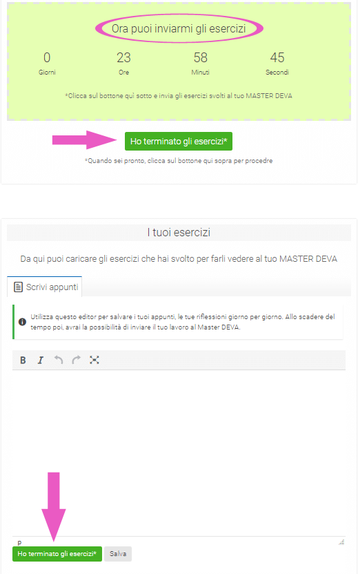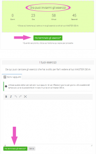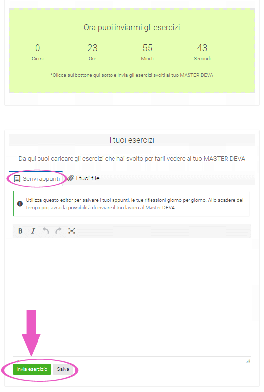 Sotto l’editor troverai abilitato solo il bottone “Salva”. Ricorda di utilizzarlo per salvare il lavoro come bozza degli esercizi. Non preoccuparti, in questo caso non vengono inviati al tuo Master DEVA.