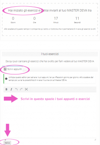 Dopo aver completato la visione del video e aver iniziato gli esercizi (quindi dopo aver cliccato sul pulsante per iniziare gli esercizi), oltre al contatore che indica il tempo mancante per caricare i tuoi esercizi troverai anche il nuovo editor – ossia strumento dove scrivere direttamente con la tastiera del pc, telefono o tablet – dove poter scrivere i tuoi appunti.